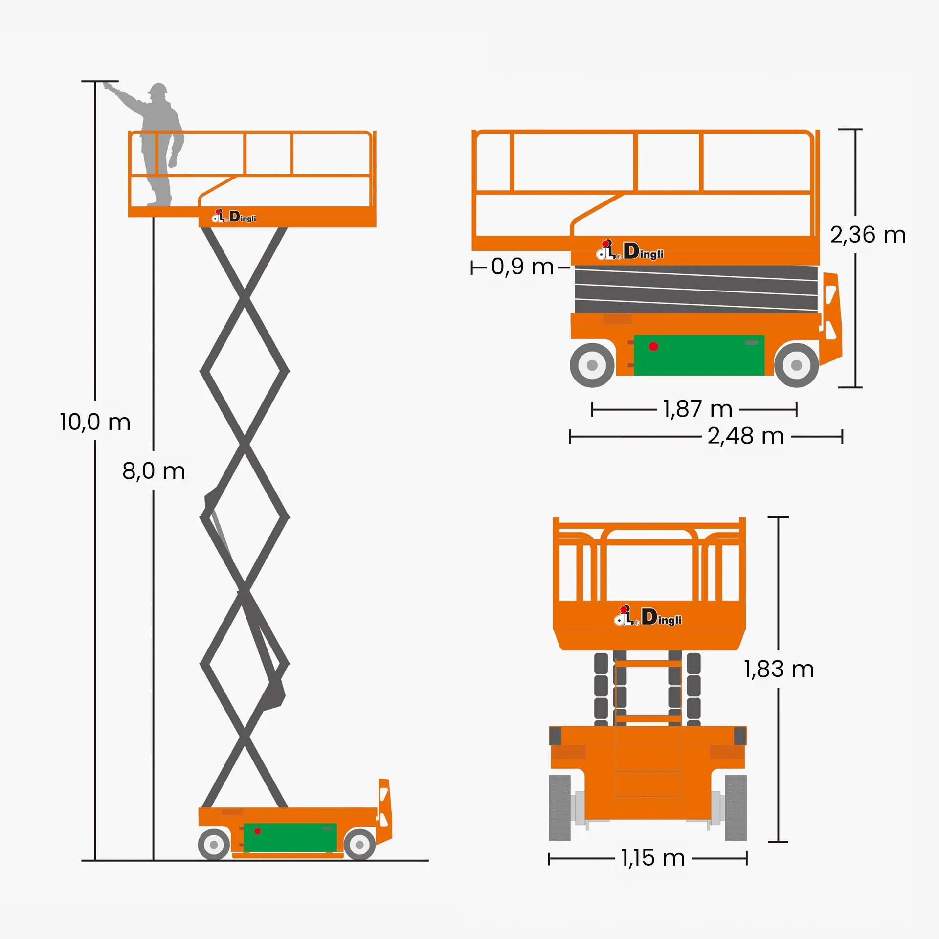 Dingli JCPT1012 er en elektrisk saxlift, der er ideel til både indendørs og udendørs arbejde. Med en maksimal arbejdshøjde på 10 meter giver den sikker adgang til højereliggende områder. Liften er kendt for sin kompakte design, der gør den let at manøvrere i trange rum. Dens elektriske drift sikrer støjsvag og emissionsfri arbejde. Perfekt til opgaver som vedligeholdelse, installation og maling.