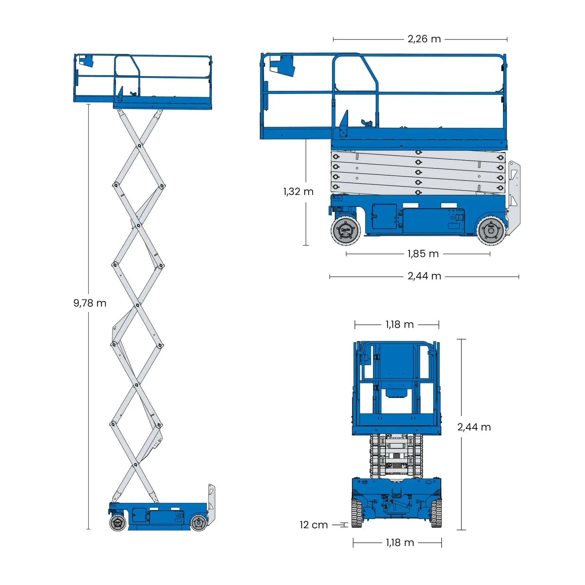 Genie GS3246 saxlift: Perfekt til indendørs/udendørs opgaver. Støjsvag elmotor, 360-graders drejning, 11,80 m arbejdshøjde, 318 kg løftekapacitet. Ideel i trange områder. Transportabel gennem standarddøre (81 cm bred).